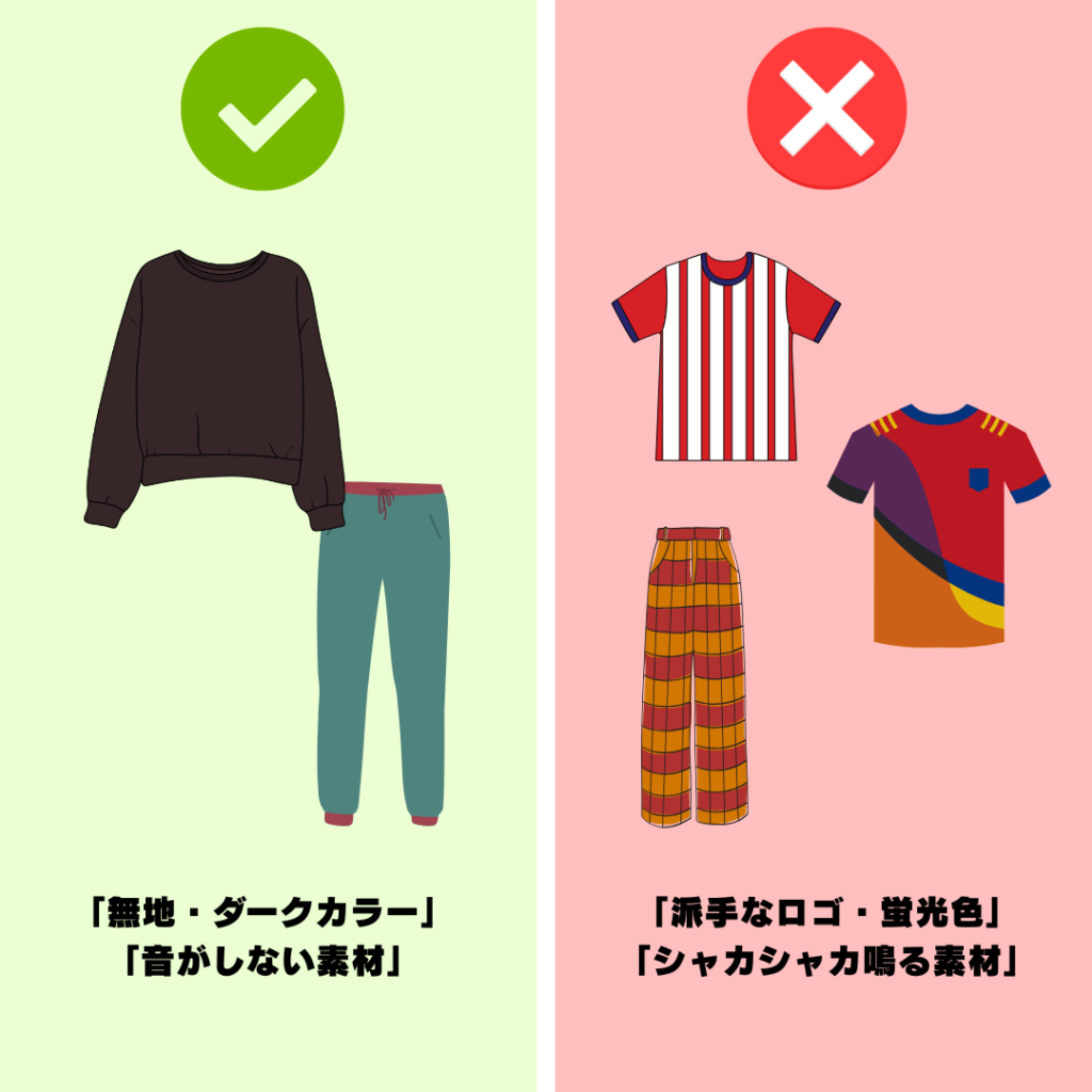 - 派手な色やシャカシャカ素材は避ける